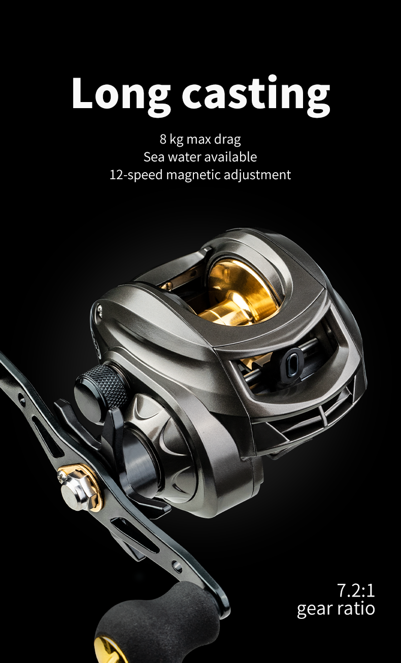 High-performance baitcasting reel designed for lure fishing. Features a durable metal spool, smooth magnetic braking system, and anti-backlash design for long-distance casting. Available in left-hand and right-hand retrieve, ideal for both freshwater and saltwater anglers.