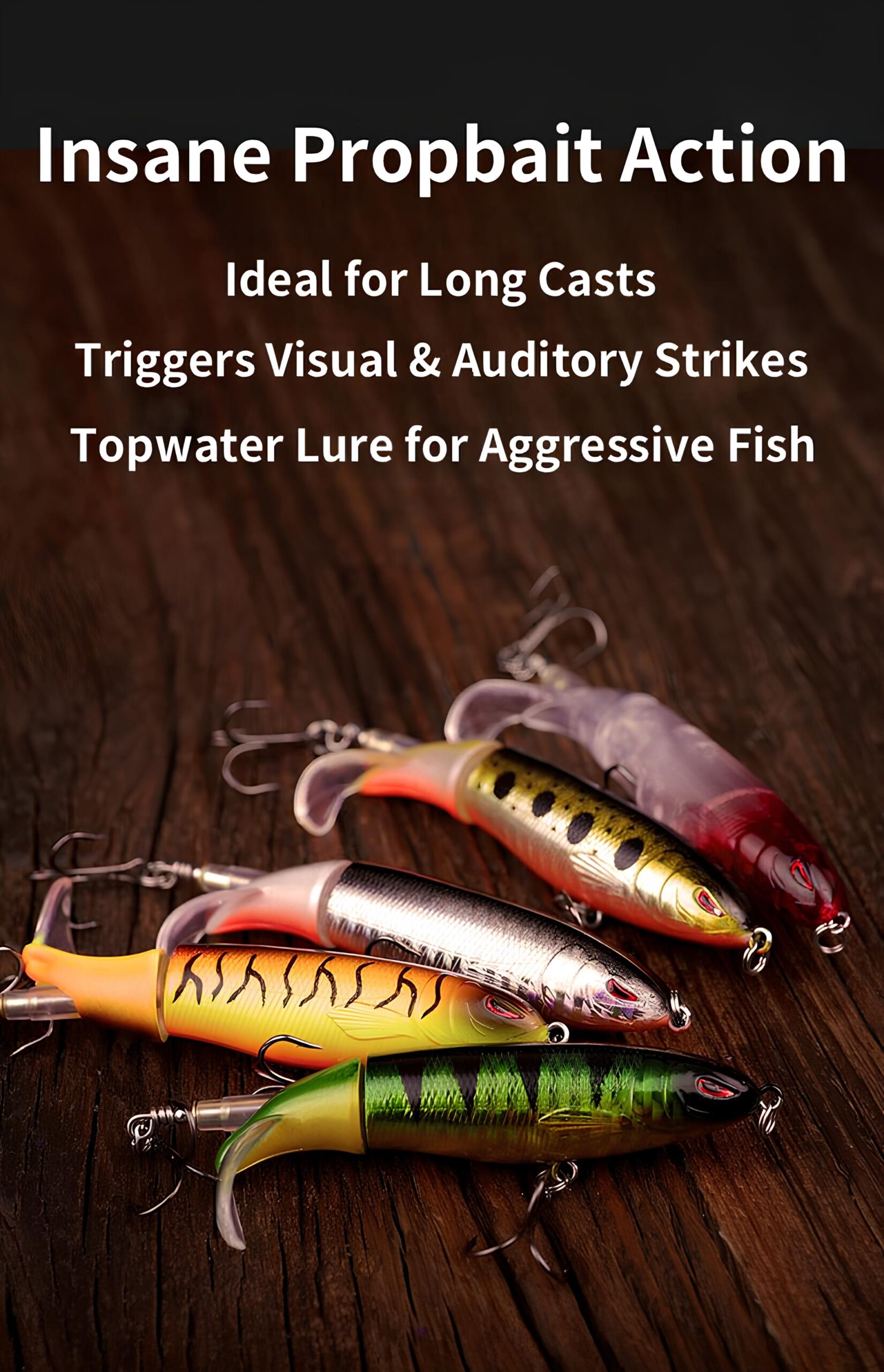 A high-performance prop bait with front and rear propellers that create splash and noise to trigger surface strikes. Features 3D lifelike eyes, premium black nickel hooks, and realistic fish patterns for aggressive topwater action.