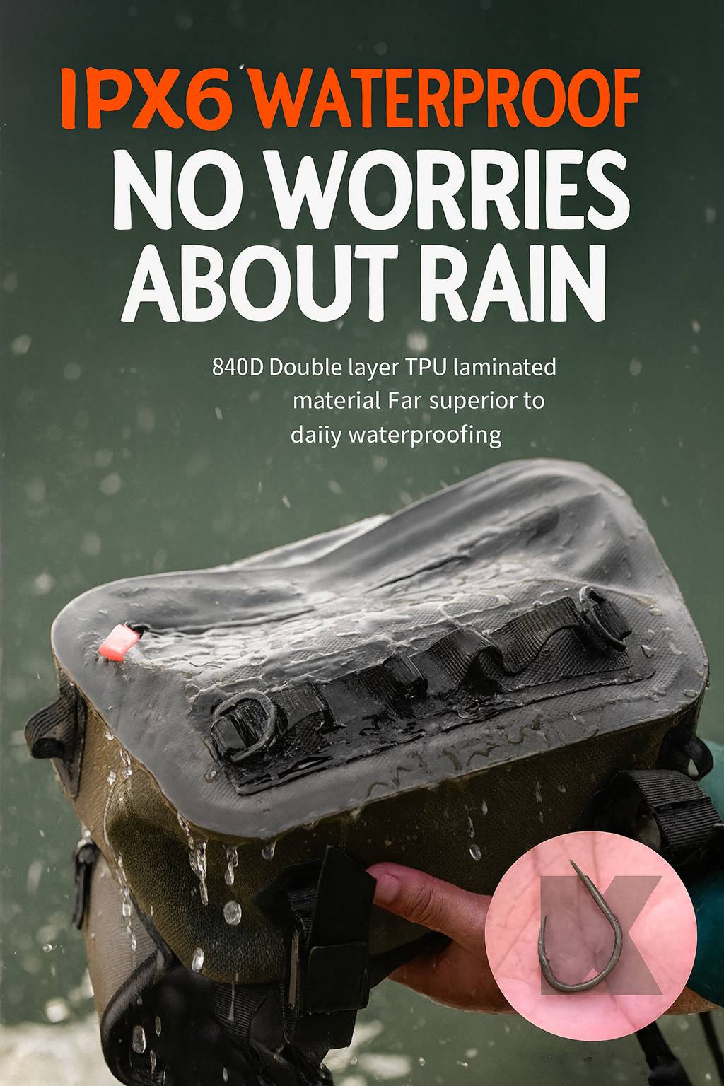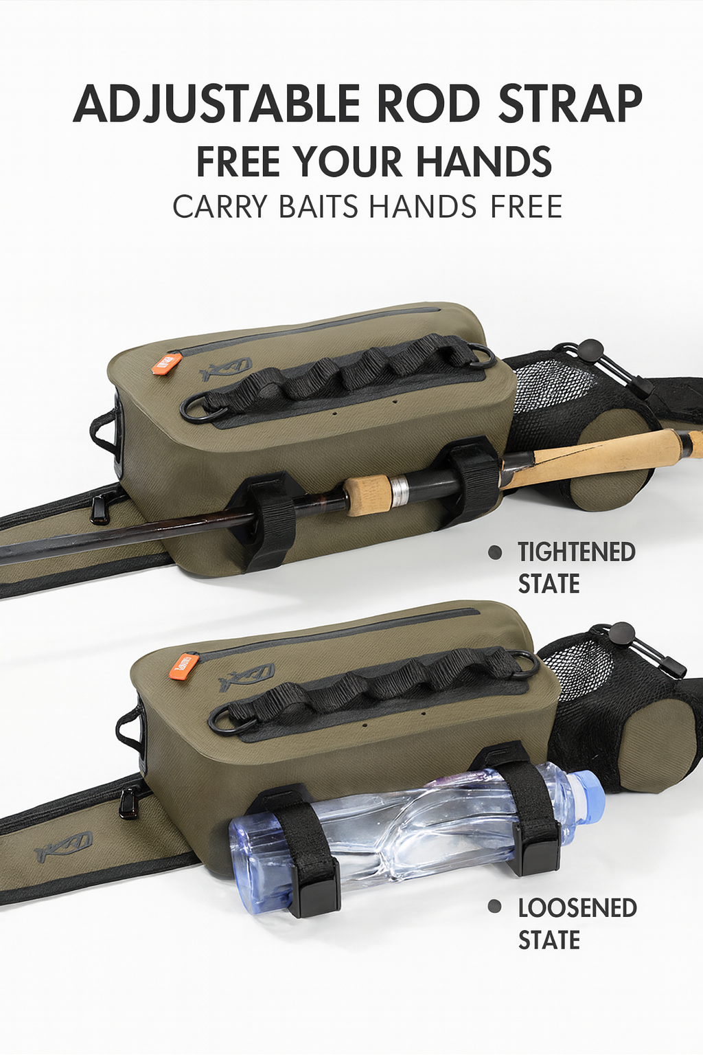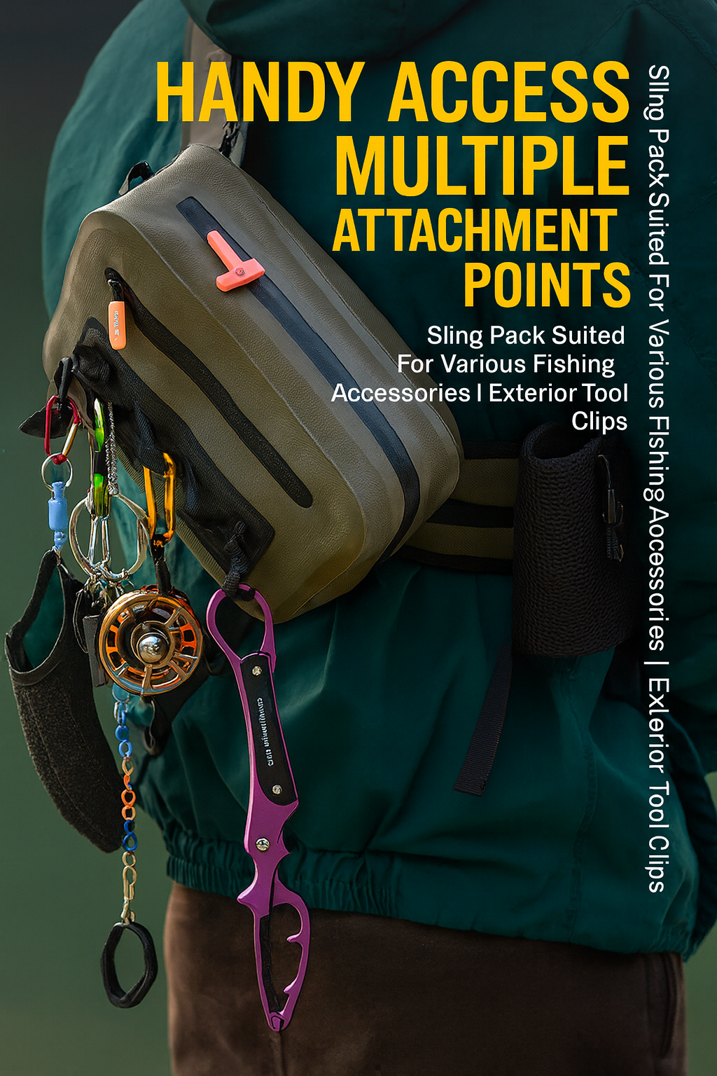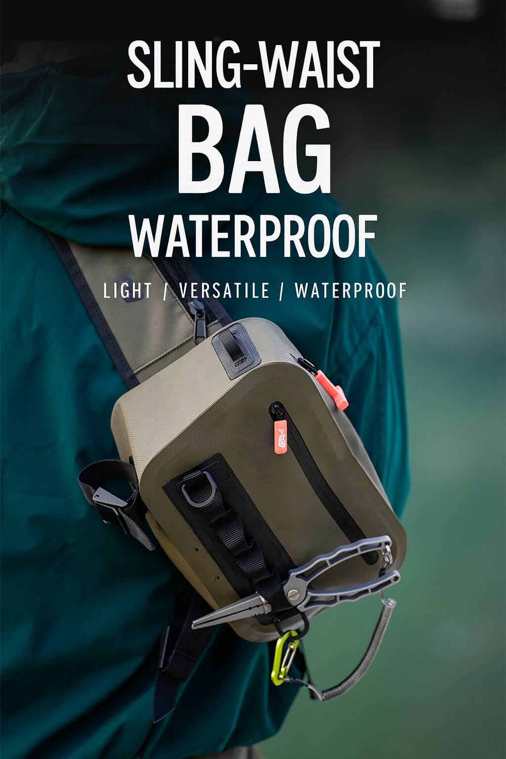 Durable waterproof sling bag designed for lure fishing and outdoor use. Features adjustable shoulder strap, multi-pocket storage, and rod holder loops — ideal for mobile anglers.