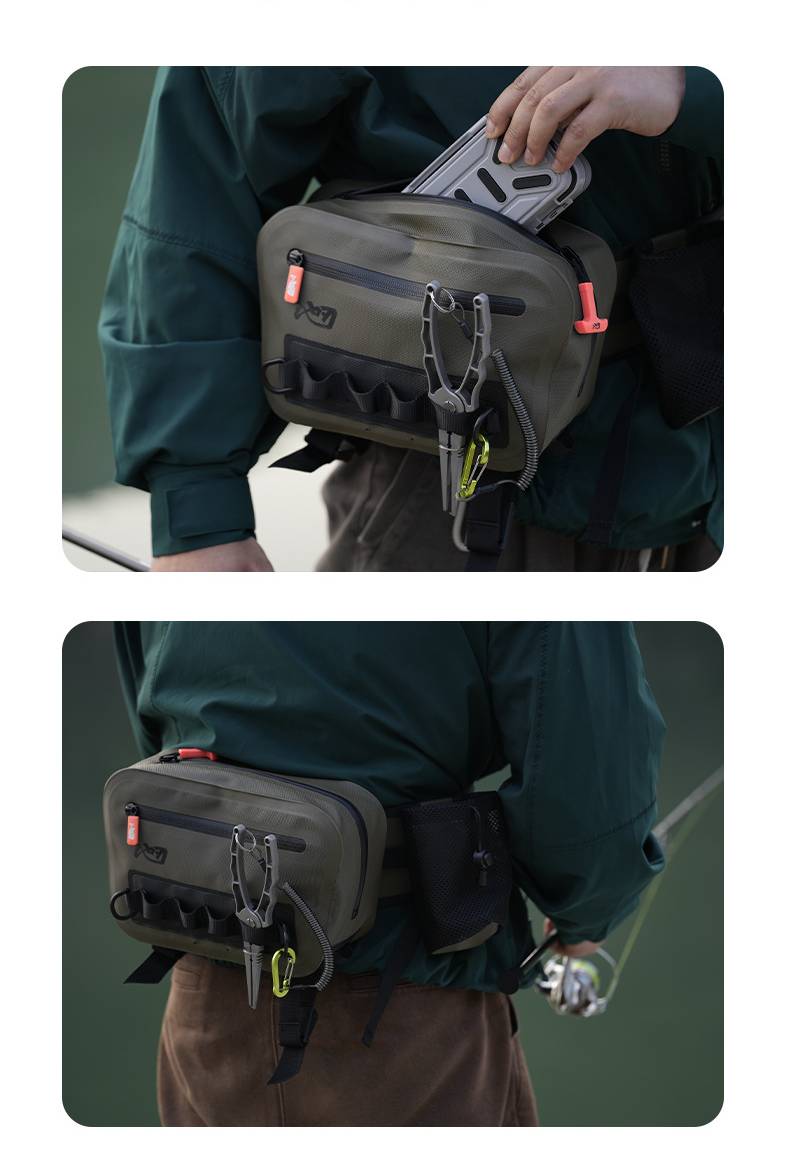 Durable waterproof sling bag designed for lure fishing and outdoor use. Features adjustable shoulder strap, multi-pocket storage, and rod holder loops — ideal for mobile anglers.